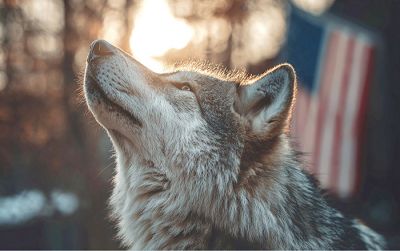 ¹ Wortlaut der Bildbeschreibung: A majestic wolf gazes upwards, bathed in golden sunlight, with an American flag blurred in the background. Symbolizing freedom, strength, and connection to nature.