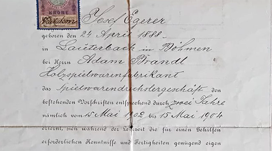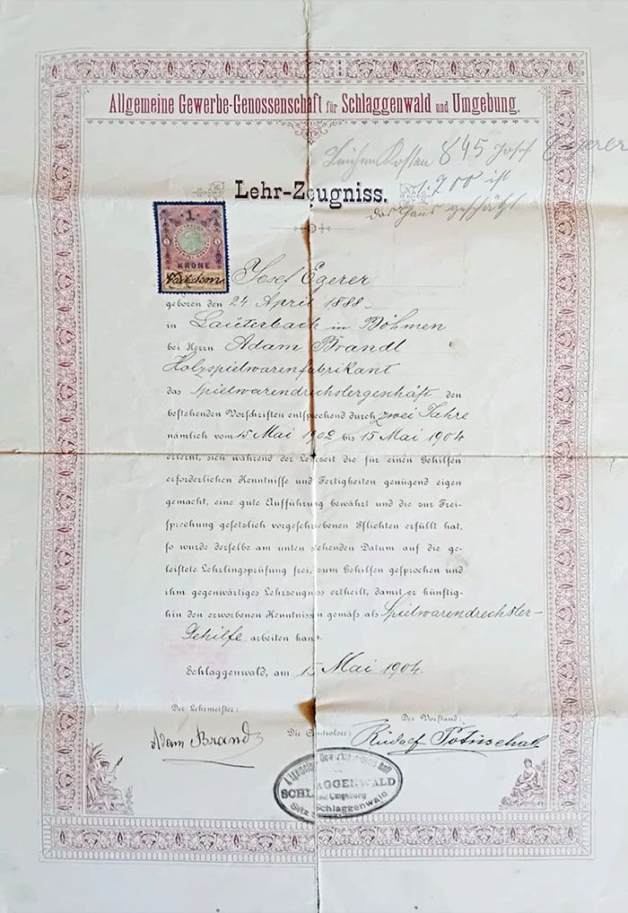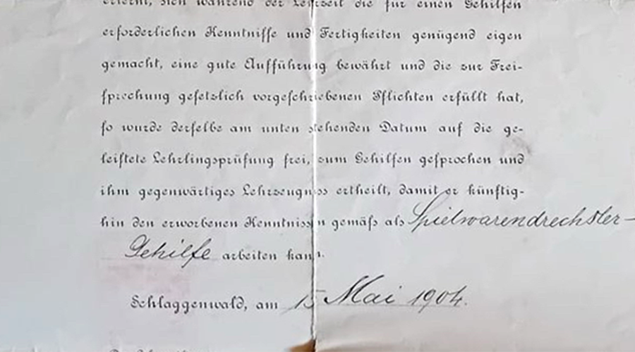 Was aber belegt dieses Zeugnis? Für mich vervollständigt sich damit das Gesamtbild meiner Vorfahren als „harmlose Vertreter“. Das meine ich nicht abwertend, sondern ungeheuer sympathisch. Im Vergleich zu manch herrschaftlichem Haus, haben wir in unserer bescheidenen Ahnentafel zumindest keine braune Linie. Daran habe ich keinen Verdienst, bin aber dennoch froh – gerade, seit ich in München lebe, wo es in einzelnen Gesellschaftskreisen nicht so gern gesehen ist, wenn unsereins flapsige Bemerkungen macht über die Hauptstadt der Bewegung und den möglicherweise daraus hervorgegangenen familiären Wohlstand. In meiner Linie finden sich nur genügsame Normalverdiener. Mein rheinischer Opa, ein friedliebender Gemütsmensch, war Schaffner auf der Drachenfelsbahn und mein böhmischer Opa, also ein Spielwarendrechsler! Ein nahezu märchenhaft unschuldiger Beruf. Diese politisch unverdächtige Abstammung macht mich glücklich.