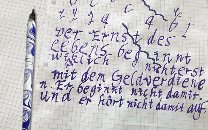 PS: Einen Ferien-Kalligrafiekurs mit Kindern in meine Kategorie „Krieg und Frieden“ einzusortieren, das hätte ich mir nie vorstellen können. Bis dato hatte ich mich zu diesem Komplex immer aus der Perspektive des friedvollen Zentraleuropäers geäußert. Wird nun aus der historischen Rückbesinnung eine reale Furcht? Es gibt eigentlich keine (literarische) Dystopie der Vergangenheit, die nicht schon in irgendeiner Form wahr geworden wäre, sei sie nun von Orwell oder Huxley oder wem auch immer ersonnen. Die Realität hat sich sogar in vielen Fällen als deutlich schlimmer entpuppt. Und trotzdem leben wir noch – und das gar nicht schlecht. Nur wer weiß, wie lang das noch gut geht?