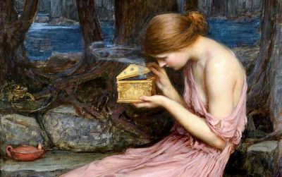 Wenn man in der griechischen Mythologie ein Behältnis öffnet, noch dazu, wenn das explizit nicht erlaubt ist, dann verheißt das meistens nichts Erfreuliches. So hofft die anfangs noch sterbliche Psyche (oben im Bild) in der goldenen Box die reine Schönheit vorzufinden und wird stattdessen von einer todbringenden schwarzen Wolke eingeschläfert.¹ In der Kunst ist das ein beliebtes Sinnbild für die Gefahren, die von leidenschaftlichem Wunschdenken und liebestrunkenen Sehnsüchten ausgehen. Für unsereins spielt das keine Rolle mehr, meine Fürsorge gilt hier ausschließlich den mir Schutzbefohlenen jungen Menschen, die ihr Leben noch vor sich haben.