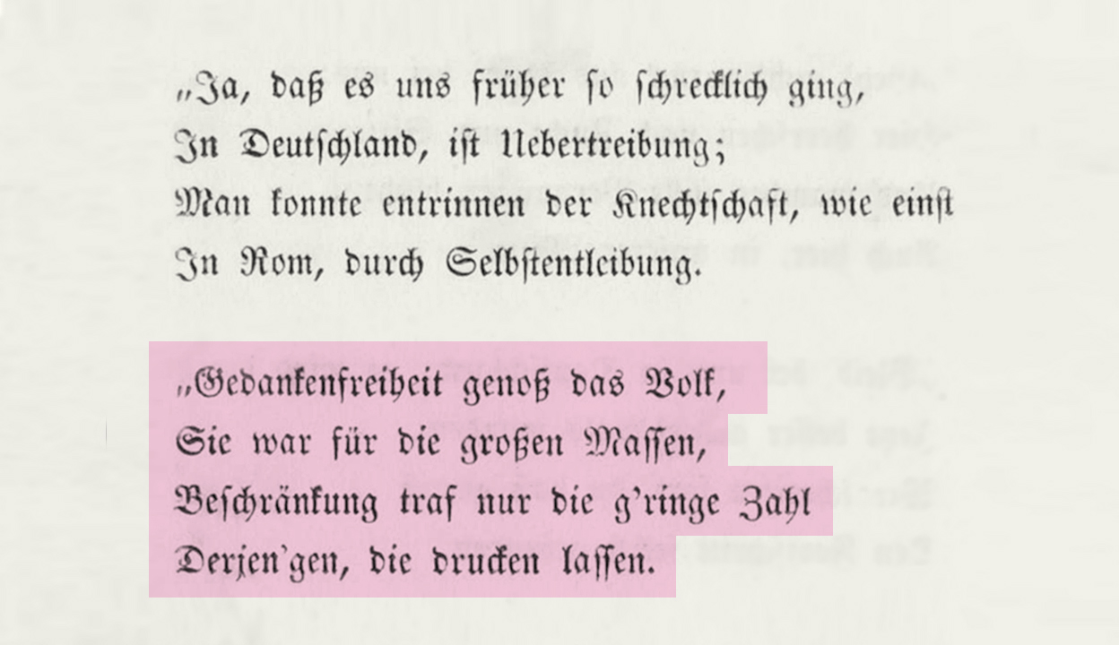 Aus Heines Wintermärchen – Ironisches Fazit anno 1844. Das 19. Jahrhundert war ein einziger Kampf gegen Zensur und Bespitzelung. Nur wer seine Gedanken für sich behielt, war auf der sicheren Seite. Wer nicht königstreu oder gar demokratisch publizierte, lebte gefährlich. Politisch Verfolgte aus Europa fanden Zuflucht in den USA und prägten entscheidend den amerikanischen Parlamentarismus. Und heute? Verkehrte Welt – Fuck Trump!
