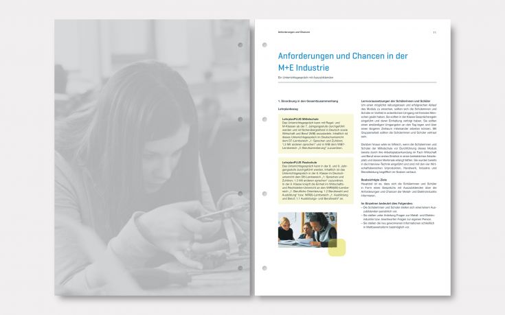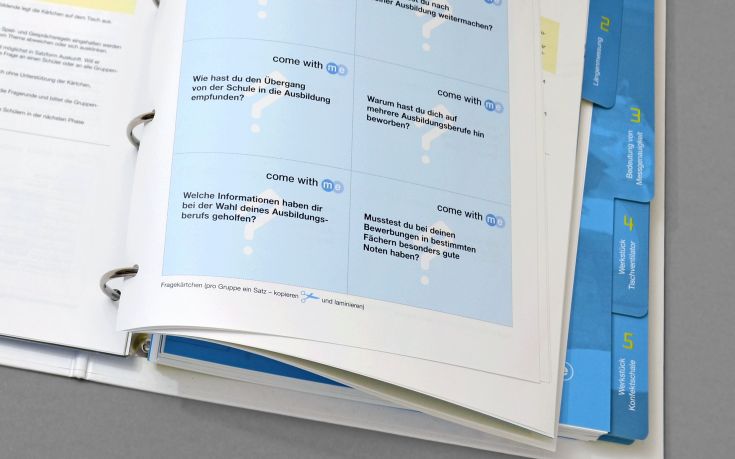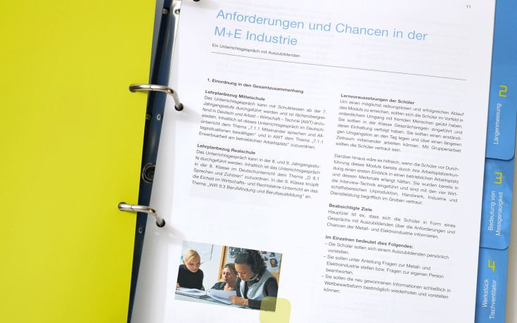 Das Bildungswerk der Bayerischen Wirtschaft hat im Projekt come with(me) ein analoges Unterrichtswerk entwickelt, dass als Loseblattfolge ständig erweitert wird und bereits dreimal komplett neu aufgelegt wurde. Viele methodische Ideen motivieren die Fantasie der Schülerinnen und Schüler an bayrischen Schulen ab der Mittelstufe für einen Beruf in der Metall- und Elektroindustrie (M+E).
