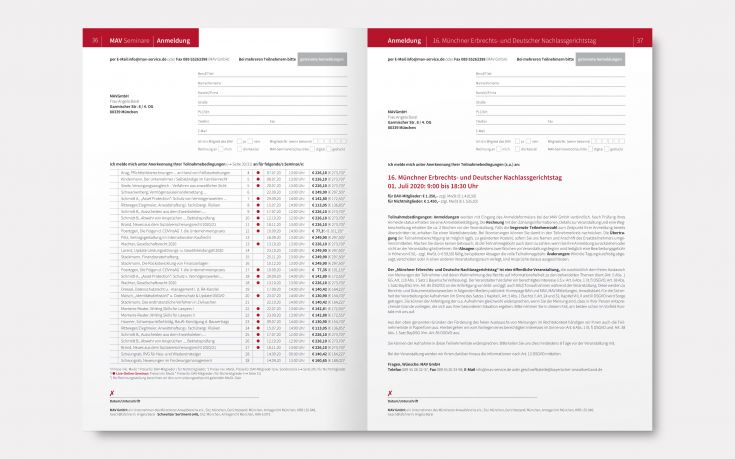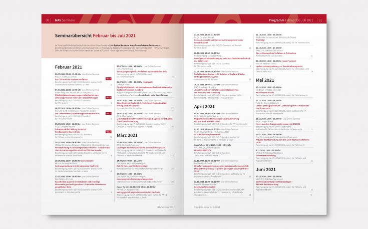Das Heft im Heft: Die Seminarbroschüre mir identischem Motiv in Sepia, Seminarkalender und Anmeldetabellen.